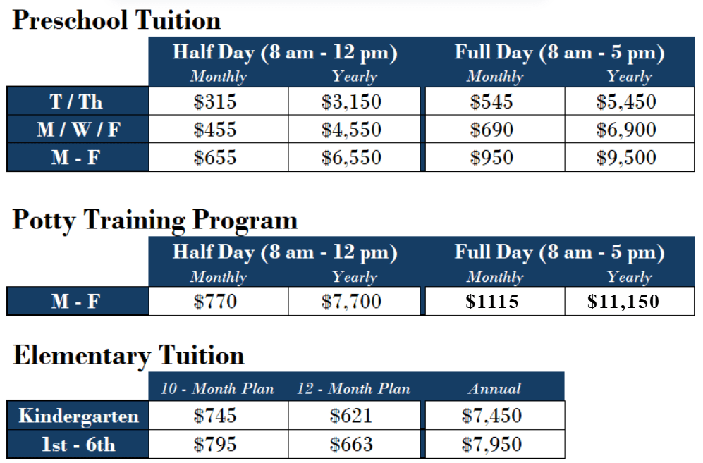 Listed below are the tuition rates for preschool and elementary. To be admitted, the registration, curriculum and testing (Elementary only) fees must be paid upon enrolling.